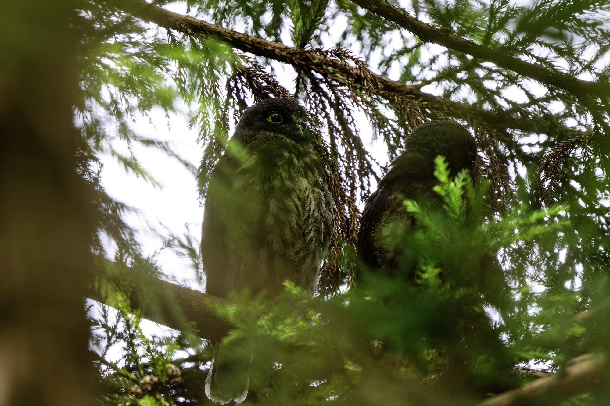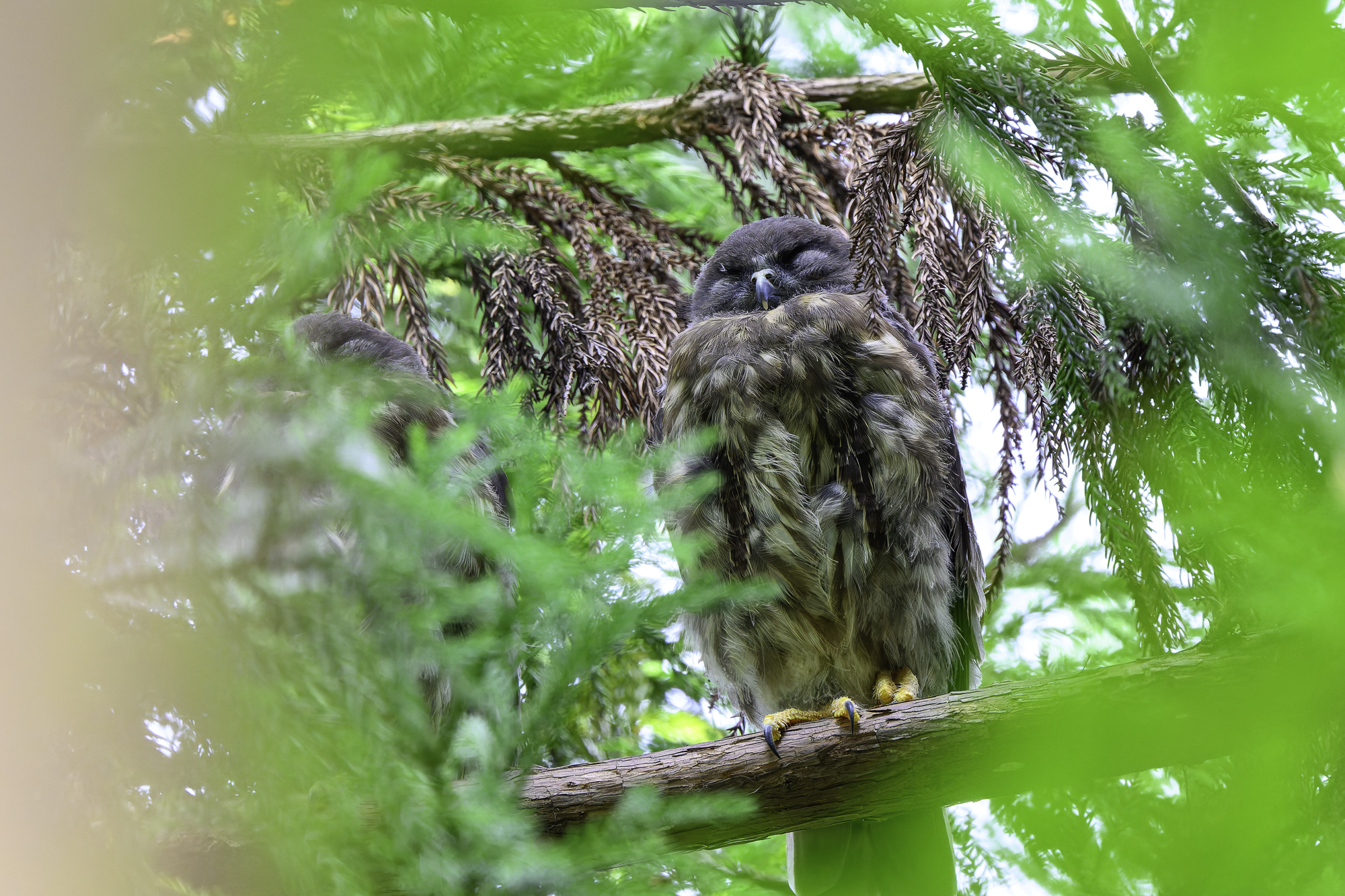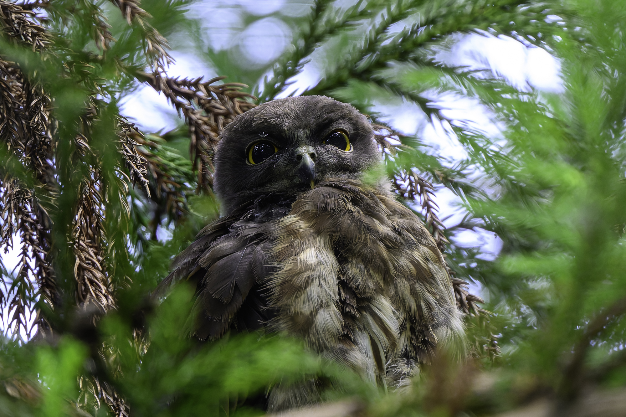アオバズクの幼鳥が育っている。中々撮影が難し野鳥なので根気よく通うしかない。夏鳥として渡来し繁殖する。フクロウ類の多くがネズミなどの小動物を主食とするが、アオバズクは昆虫を主食とし、町や村の神社の樹林程度の環境でも街灯を餌場として繁殖する。 幼鳥が目の前を通過する昆虫に反応しています。狩りの本能ですね。