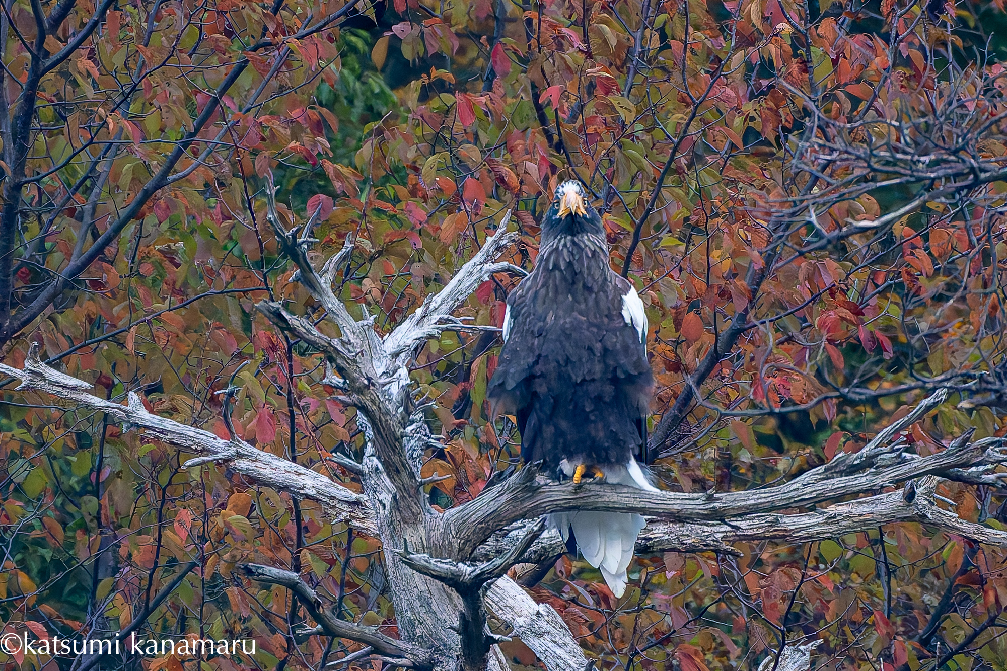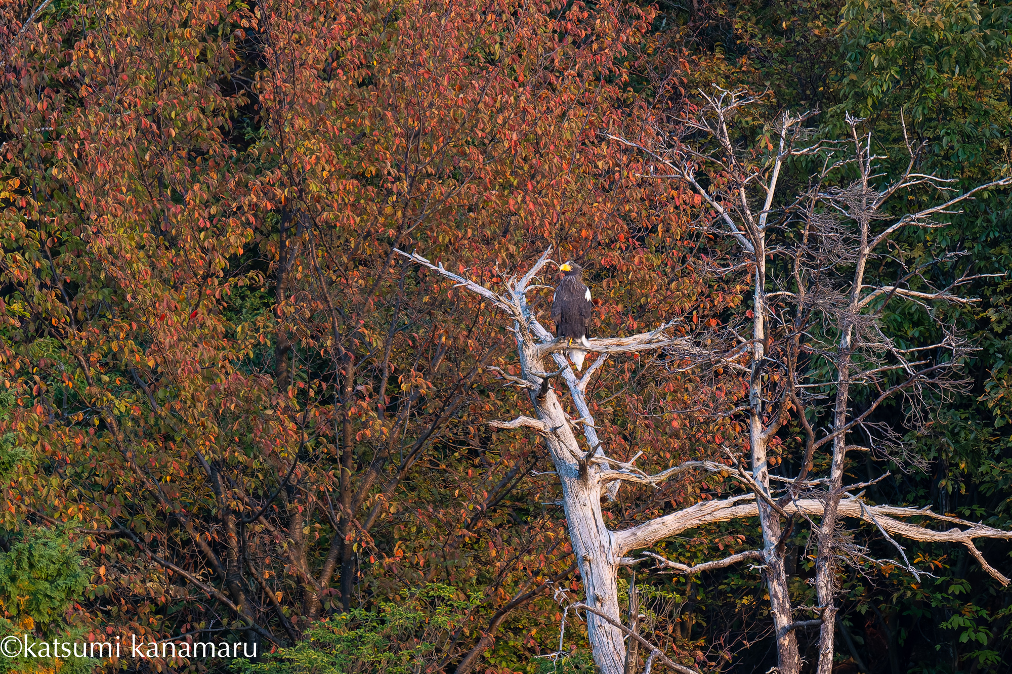 伊吹山で渡来の知らせを聞いた。イヌワシは昼頃から飛び出したが、風に乗って高くを飛んでいる。j昼前は時雨とガスで視界がなかった。晴れ間が広がると飛び出した。親ワシは父母ともそのうが膨れていた。若鳥サーナは、西尾根の斜面の木の枝にとまって動かない。親が飛べば子も飛ぶが今日は、おなかが満たされているのか飛ばない。14時過ぎから再び時雨れ。この時雨が背を押して急遽、オオワシを見に行くことにした。今日行かなくても、明日行くことになるはず。一日でイヌワシとオオワシを見るこを密かに狙っていた。