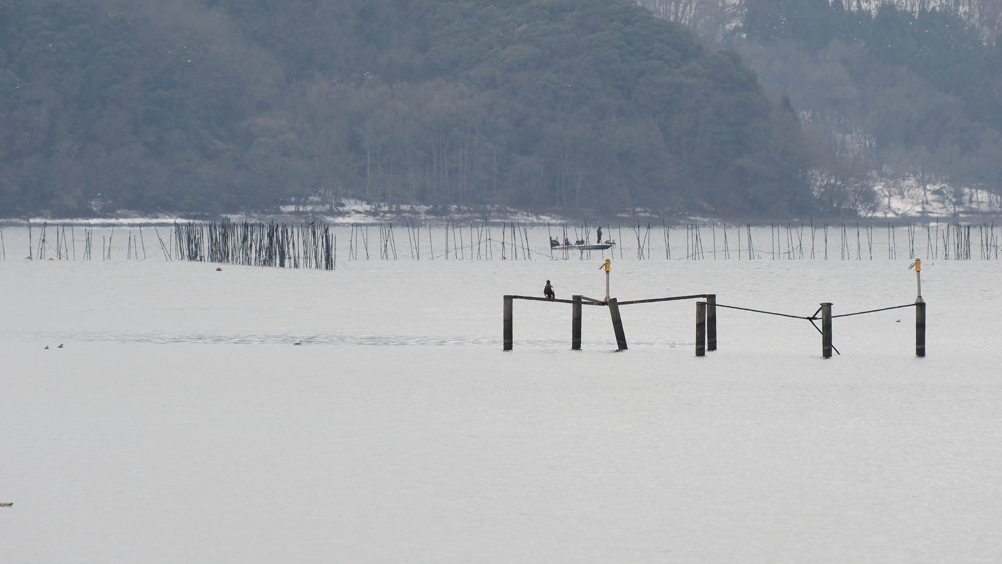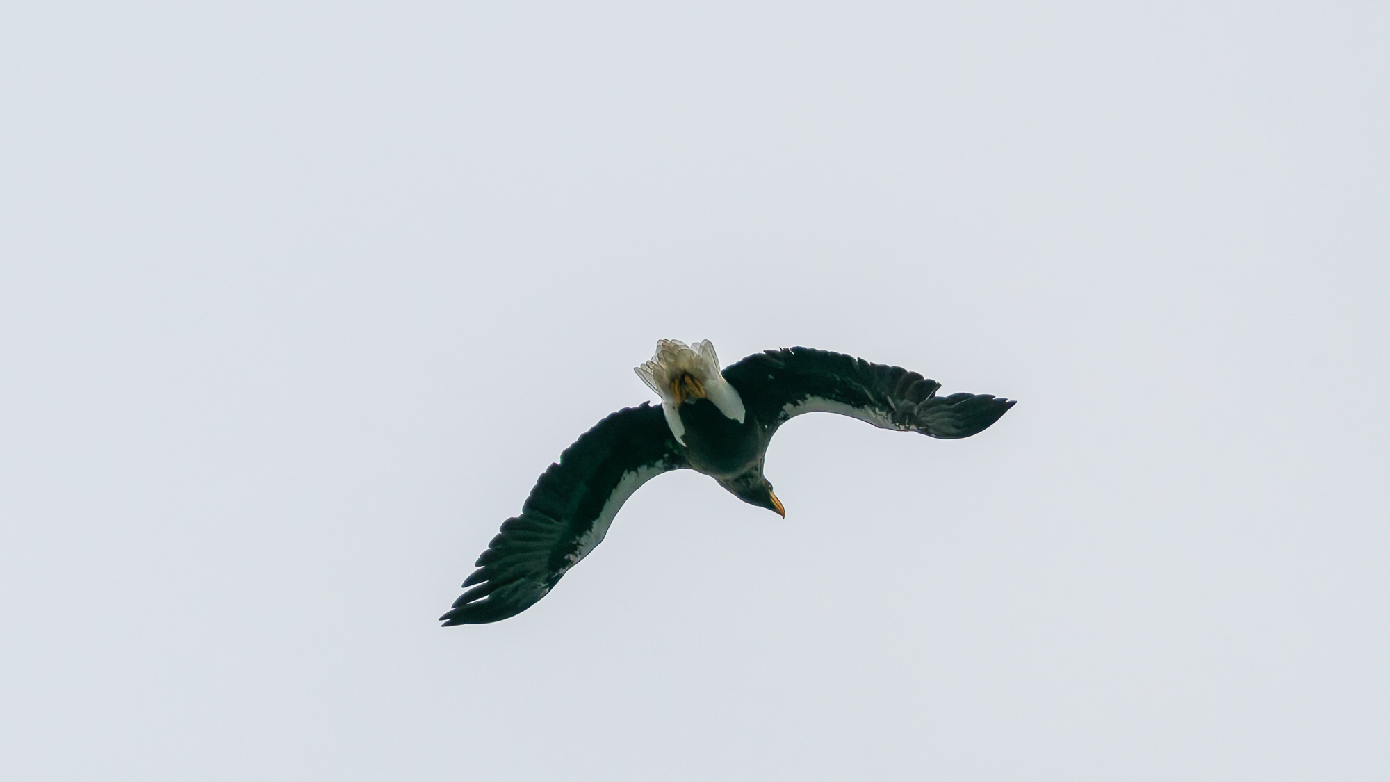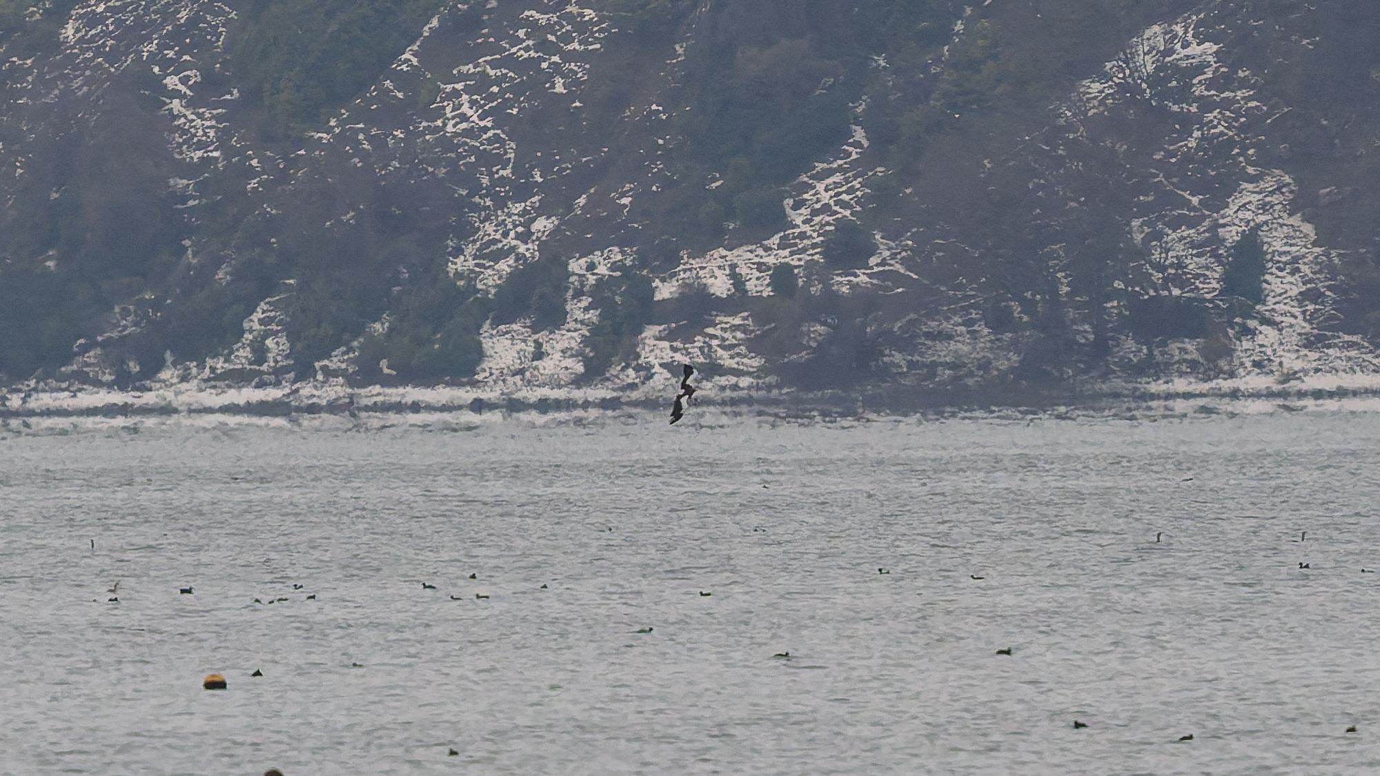こちらの湖岸に立つやいなや、オオワシのおばあちゃんが狩りに出た。これを撮り逃せば、今日一日が終わってします。サブ機OM-1 ED50 200で追いかけた。ポジション取りの前なので遠すぎる。取水塔付近で狩りして取水塔で完食。その後山本山に帰り昼まで大休止。石川に出てきたが、動かず。終了となった。