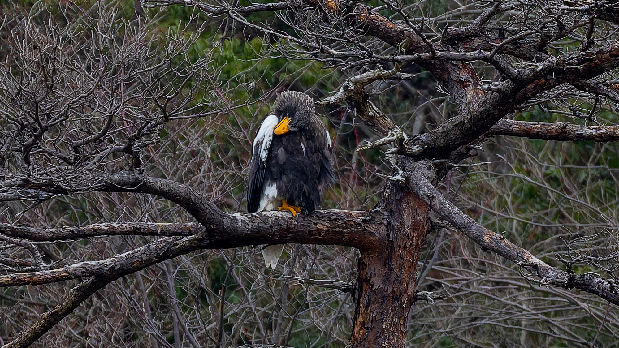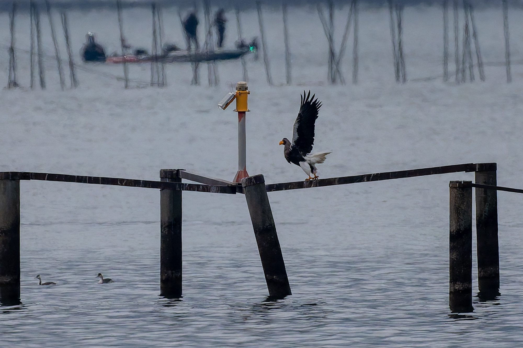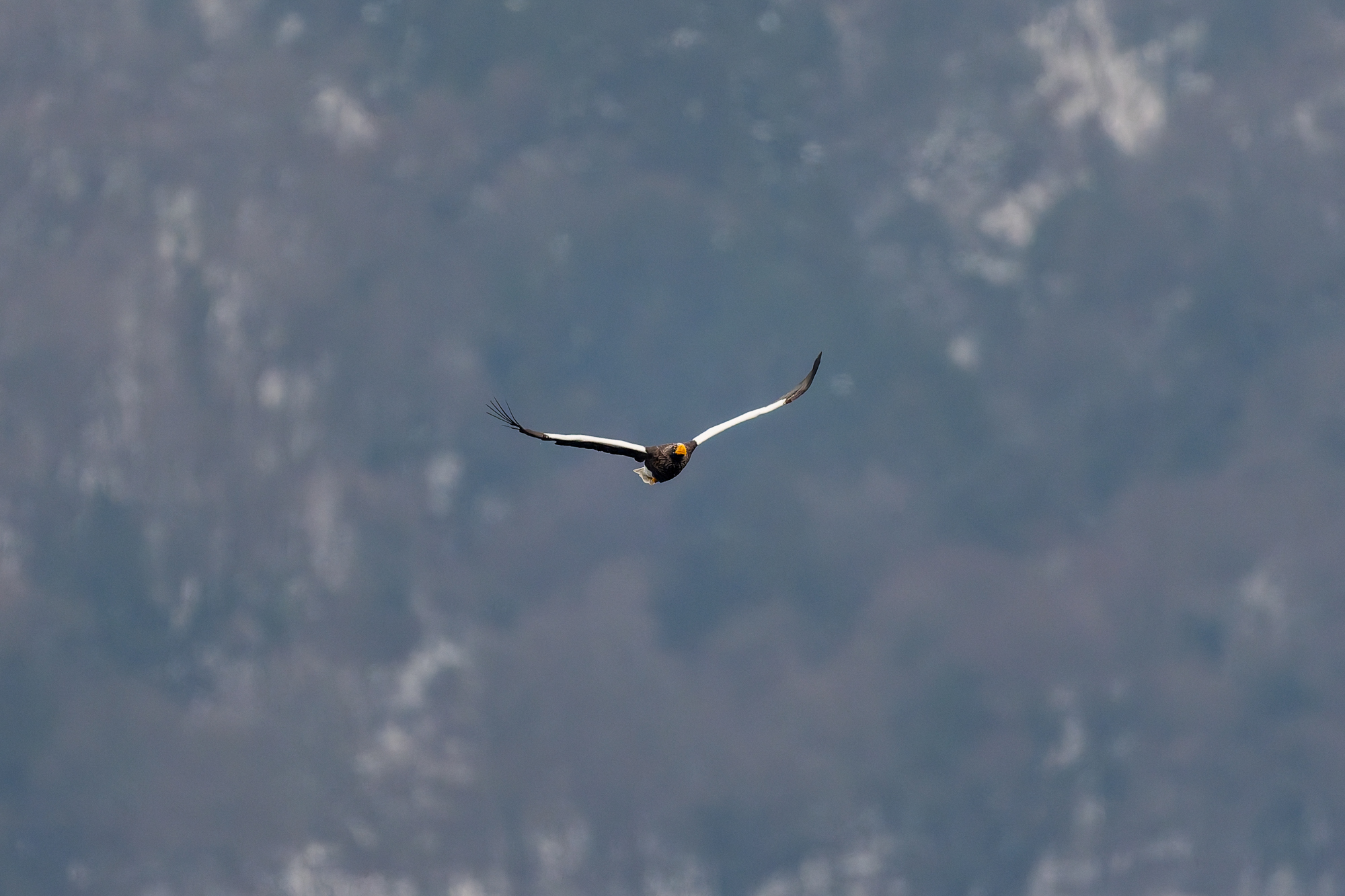 こちらの湖岸に立つやいなや、オオワシのおばあちゃんが狩りに出た。これを撮り逃せば、今日一日が終わってします。サブ機OM-1 ED50 200で追いかけた。ポジション取りの前なので遠すぎる。取水塔付近で狩りして取水塔で完食。その後山本山に帰り昼まで大休止。石川に出てきたが、動かず。終了となった。