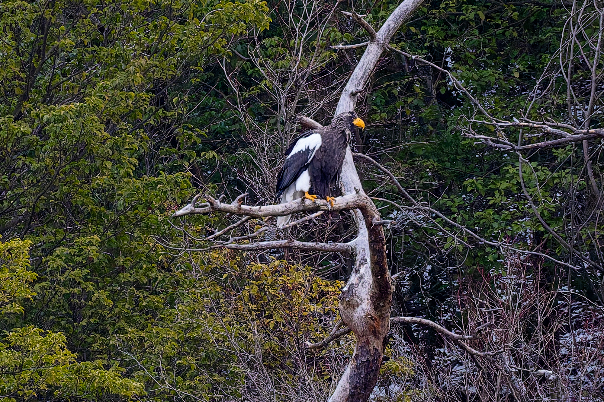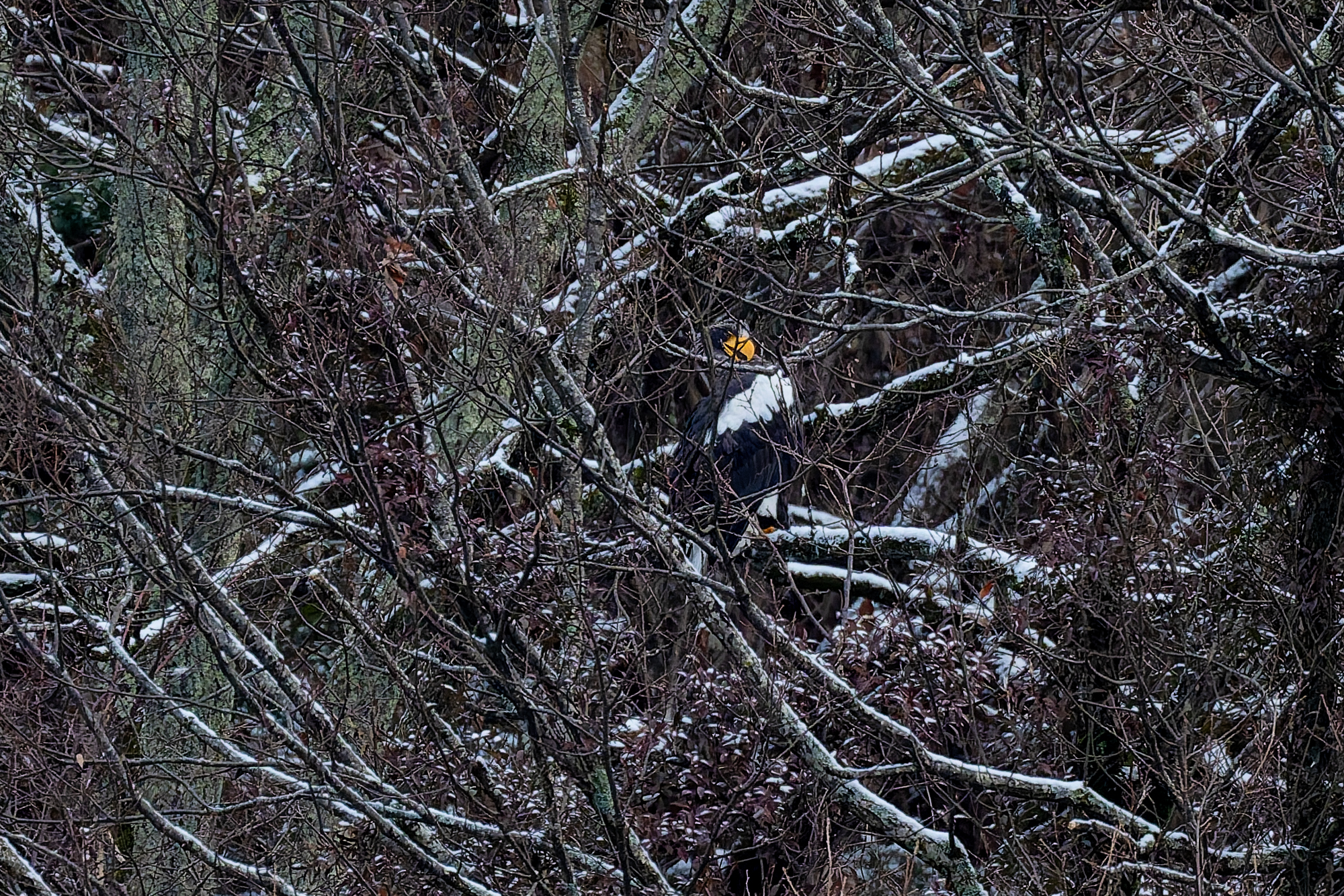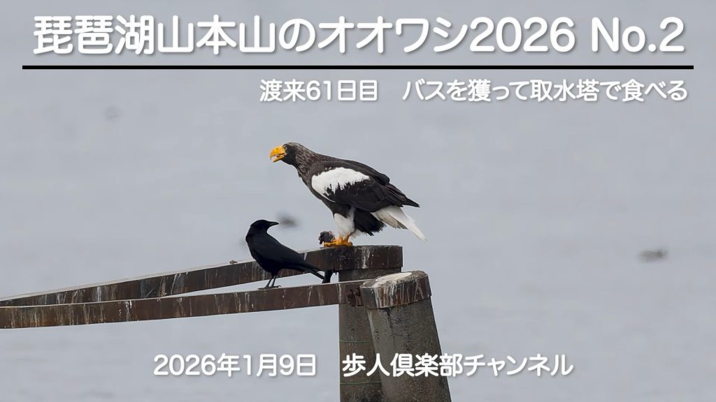photocb 琵琶湖のオオワシ2026 2026年1月9日 2026年2月11日 野鳥センターの記録引用 8:25石川の枯木に発見13:16尾上沖を飛び、石川の枯木にとまる13:30尾上沖でオオクチバスをとり、取水塔で食べる北斜面の広葉樹に移動南斜面の地上に降りる第2ねぐらに入る16:45第4ねぐらに入る YouTube 塒のオオワシ 石川に移動 カワアイサ 狩りに出る 帰る