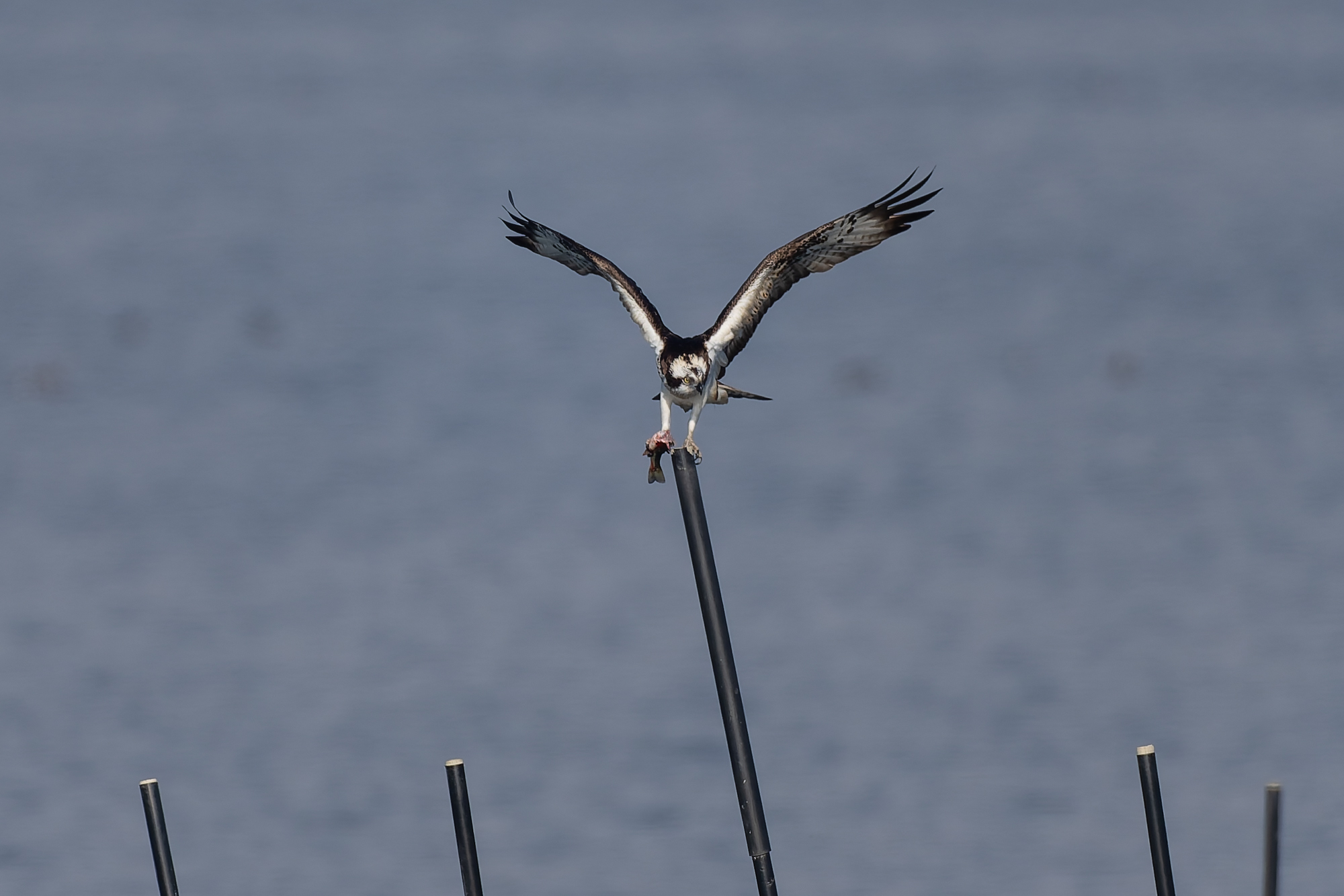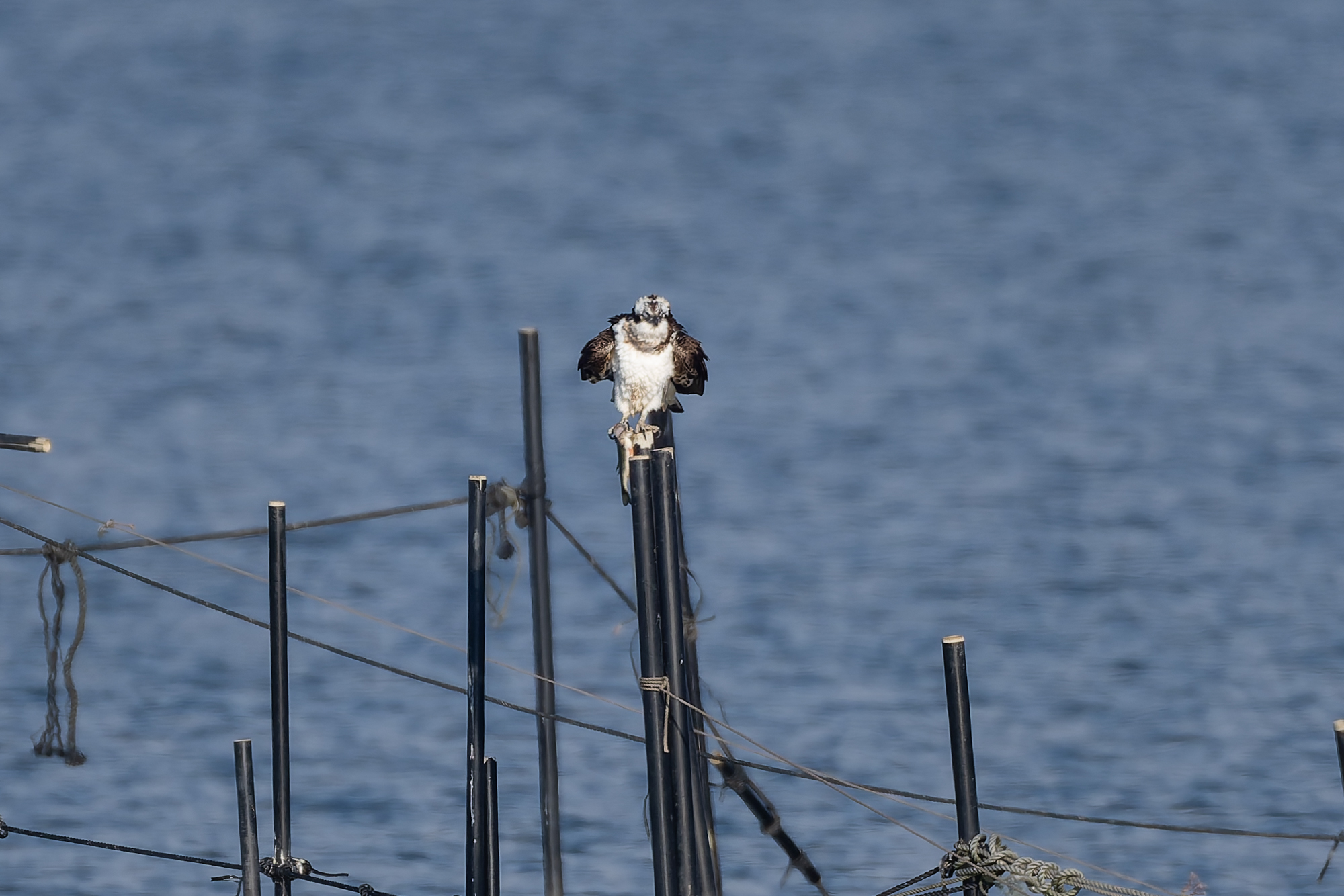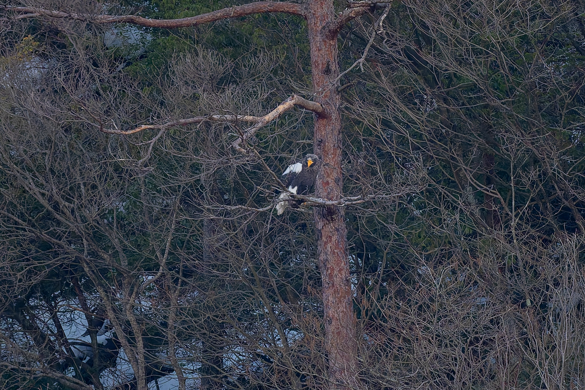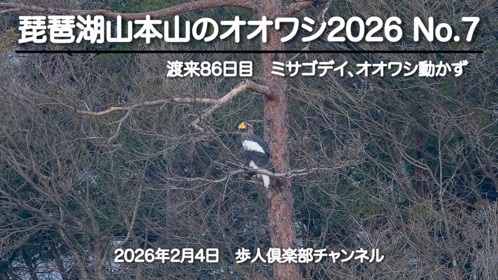 photocb 琵琶湖のオオワシ2026 2026年2月4日 2026年2月11日 オオワシのおばあちゃん、風がなく穏やかな一日になった。すでに渡来86日目になる。塒から出たが、石川の枯松にとまり動かず。ミサゴが何でも湖岸に沿って飛びバスを獲ってエリで食べた。マガモやカワアイサは良く動いていた。 野鳥センターの記録 8:40 石川の枯松で発見 15:33 片山の落葉樹に移動 17:17第4ねぐらで発見 YouTube オオワシ 石川の枯松 マガモ オオワシ動かず カワラヒワ カワアイサペア カワアイサオス ヒドリガモ カワウ ミサゴが湖岸で狩りしてエリで食べる ミサゴがバスを獲った ホオジロガモ トビが来た 餌をもって場所移動するミサゴ マガモが 野田沼から琵琶湖へ移動