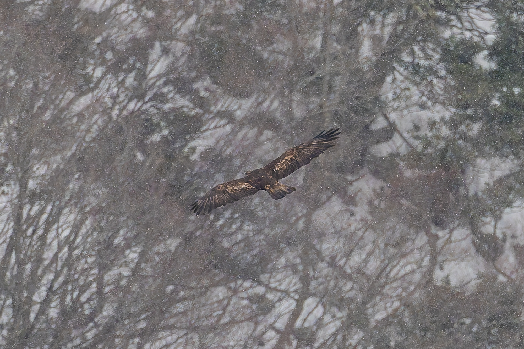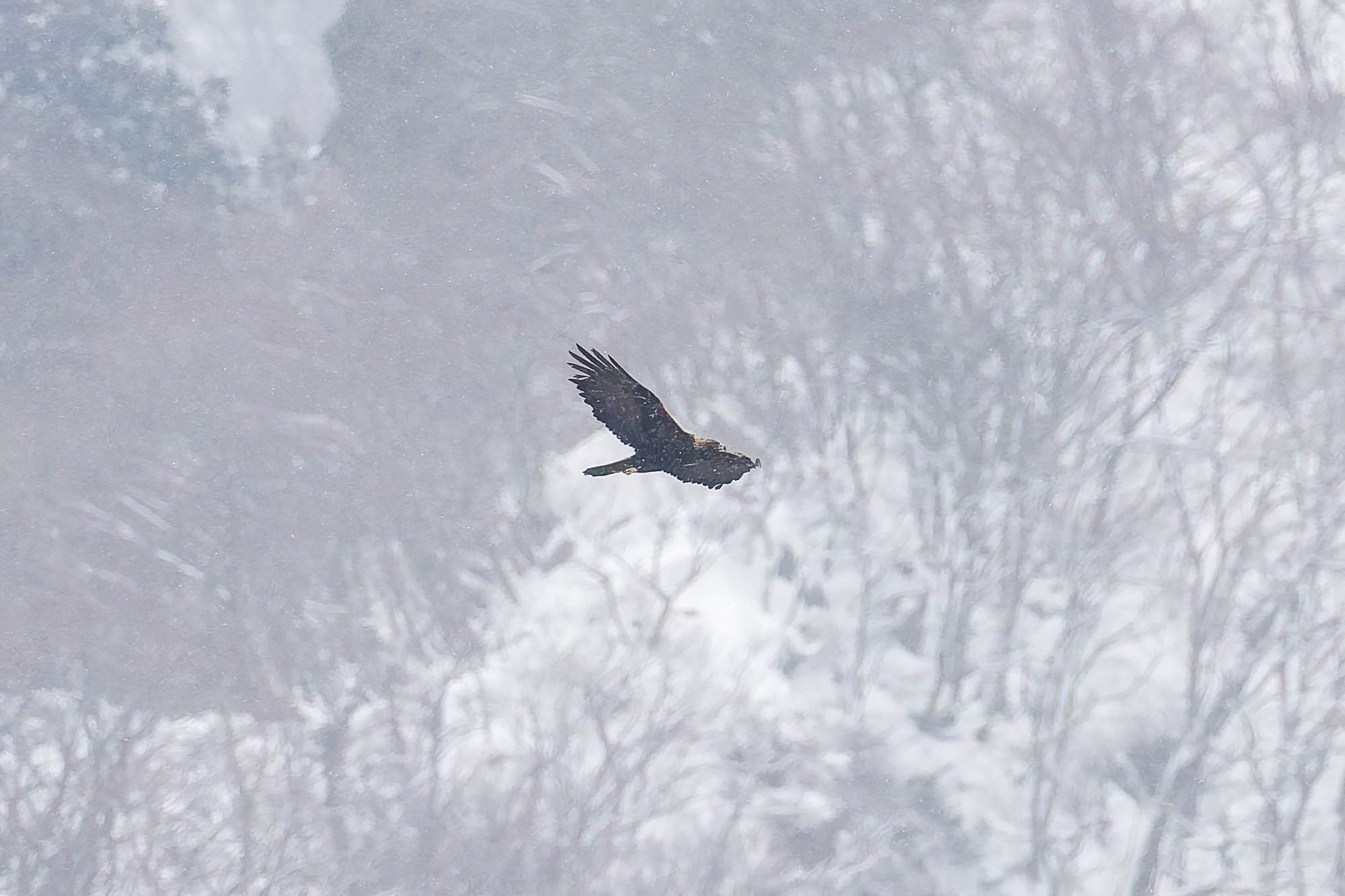 寒風の中4時間待たされた。身も心も凍え限界が近かった。谷からイヌワシが上がってきた。そのうが膨れている。これで狩りに出なかった理由が判明。この1時間前に、オスとメスが呼び合う鳴き声が30分くらい続いた。いつ出るかと構えるがその時は出てこなかった。