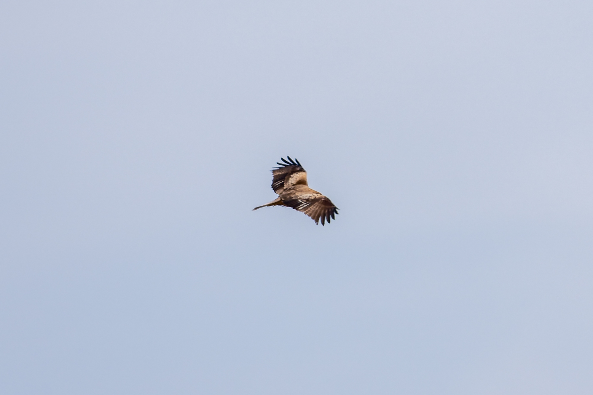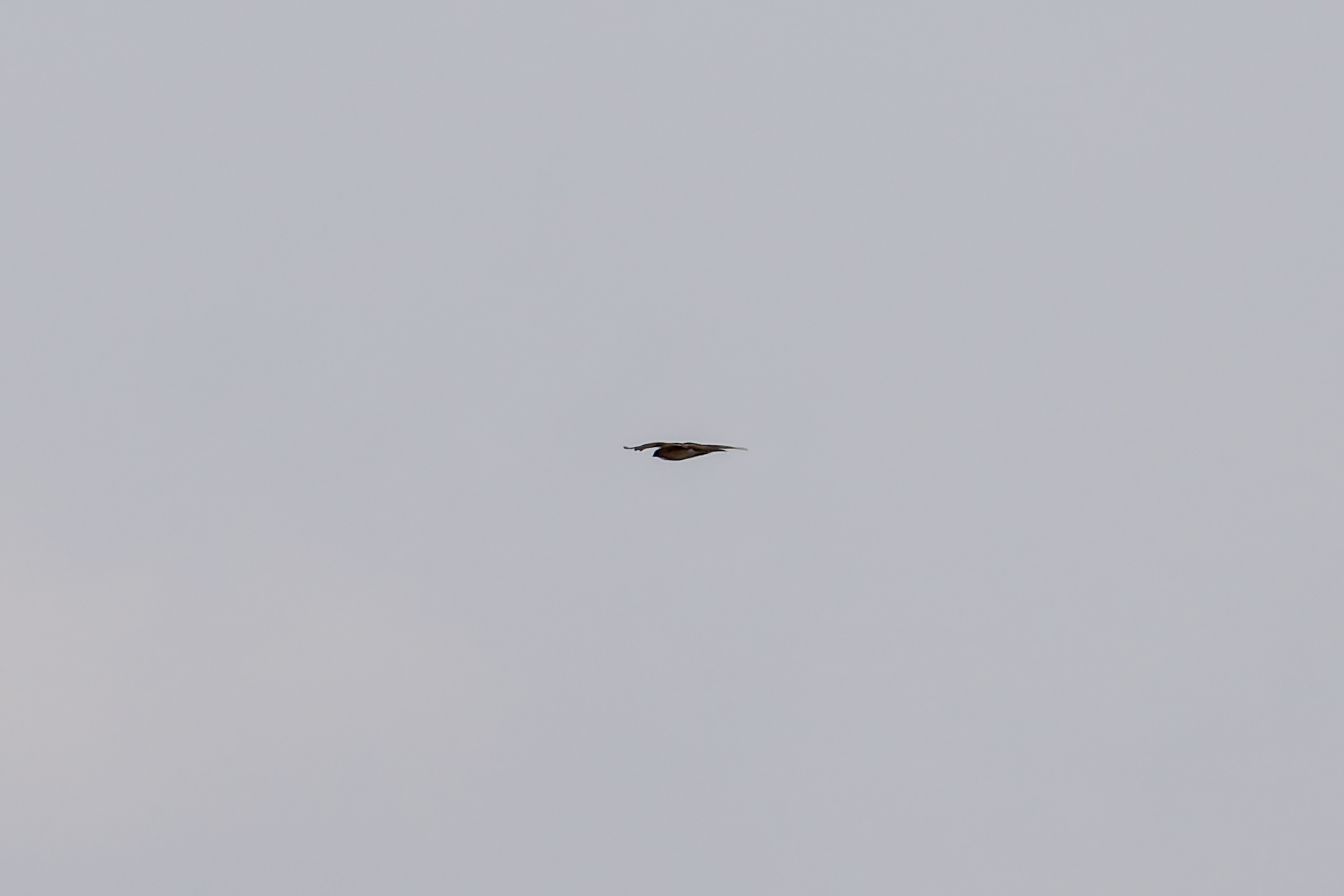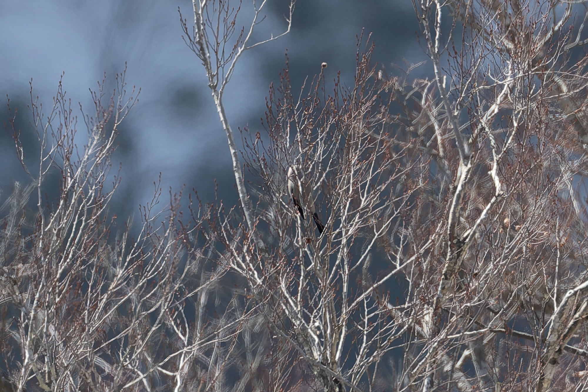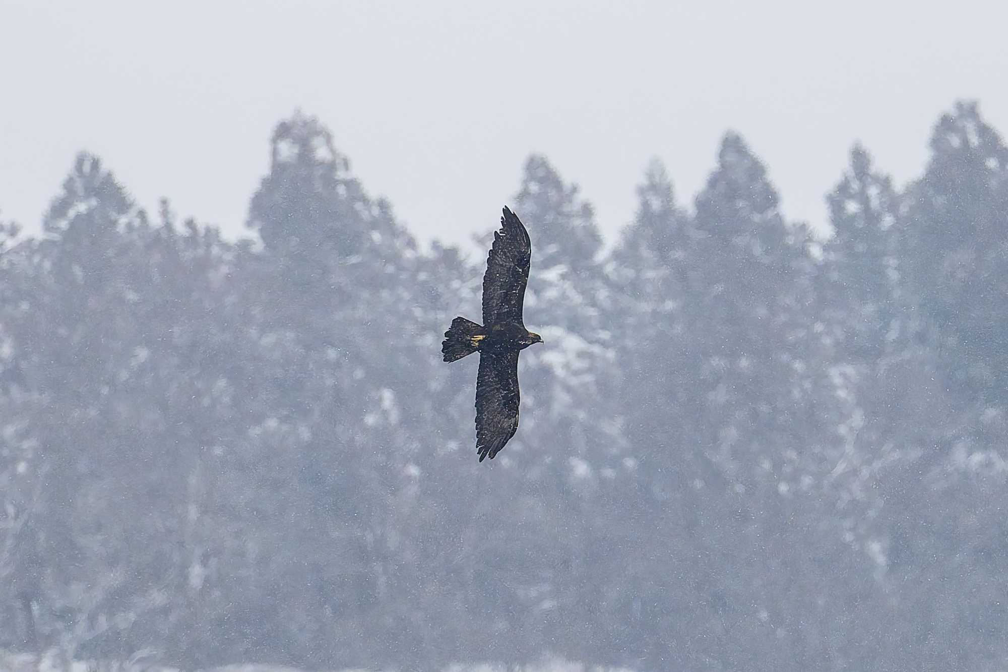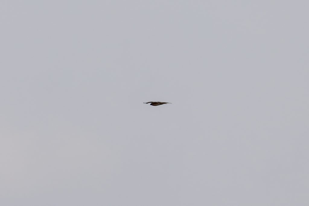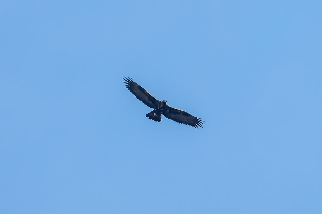 断続的にイヌワシの鳴く声、昼過ぎに稜線で交尾の鳴き声が聞こえた。稜線からの飛び出しを待っていると、雌が出てきた。チャンスはこれ一回だけで、距離も遠かった。この日ははいたかも何度か鳴いていた。