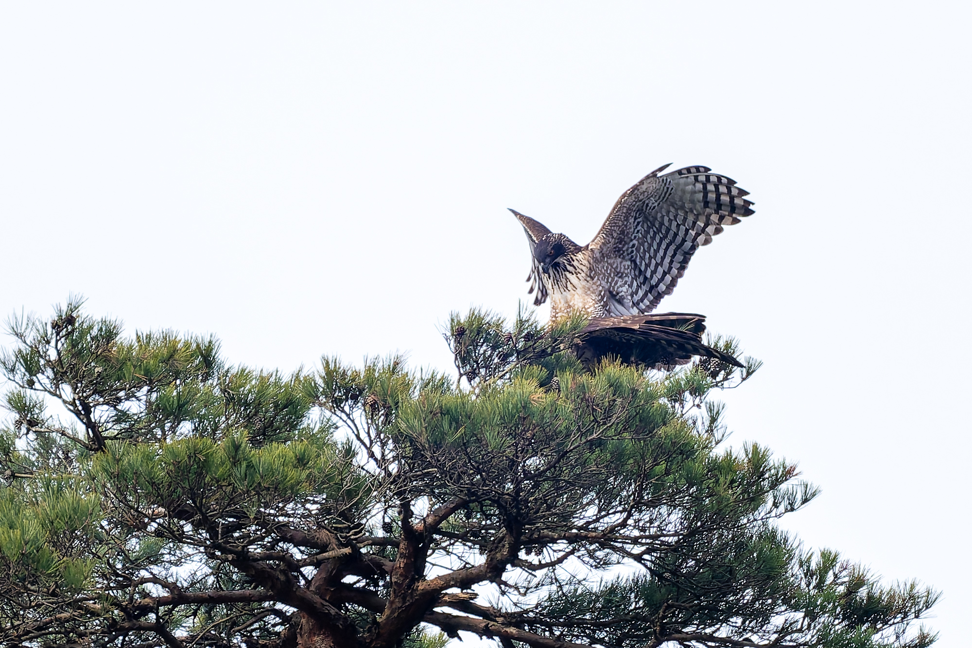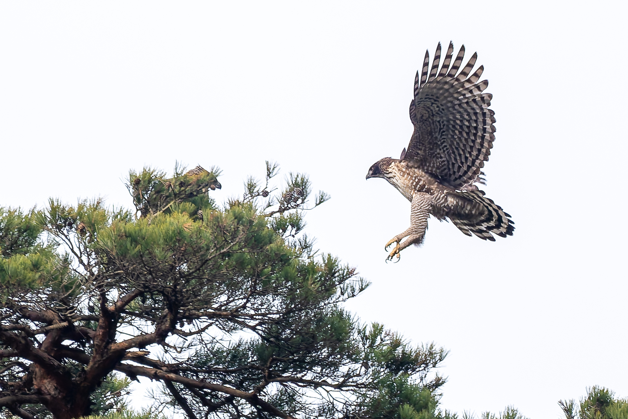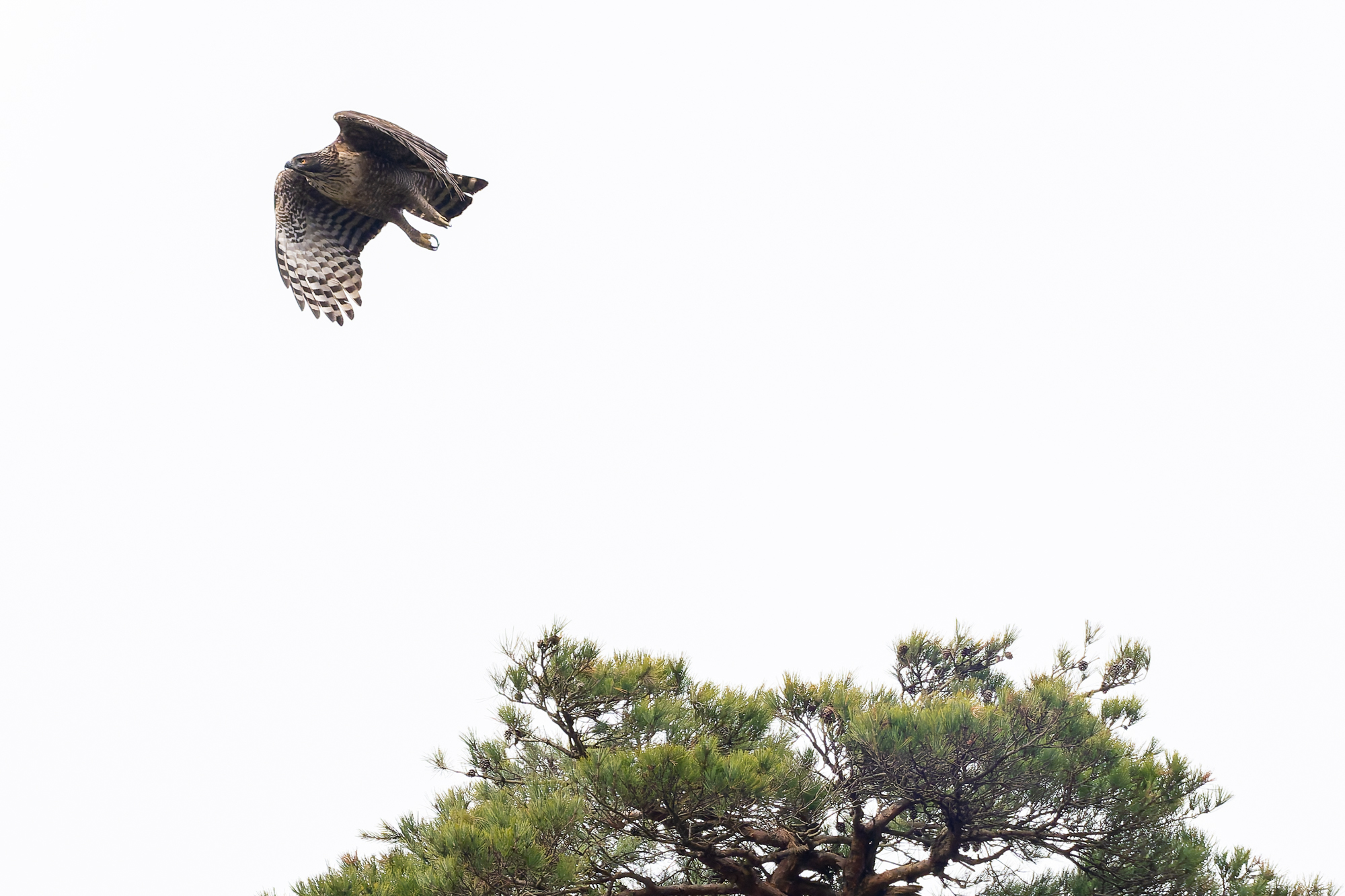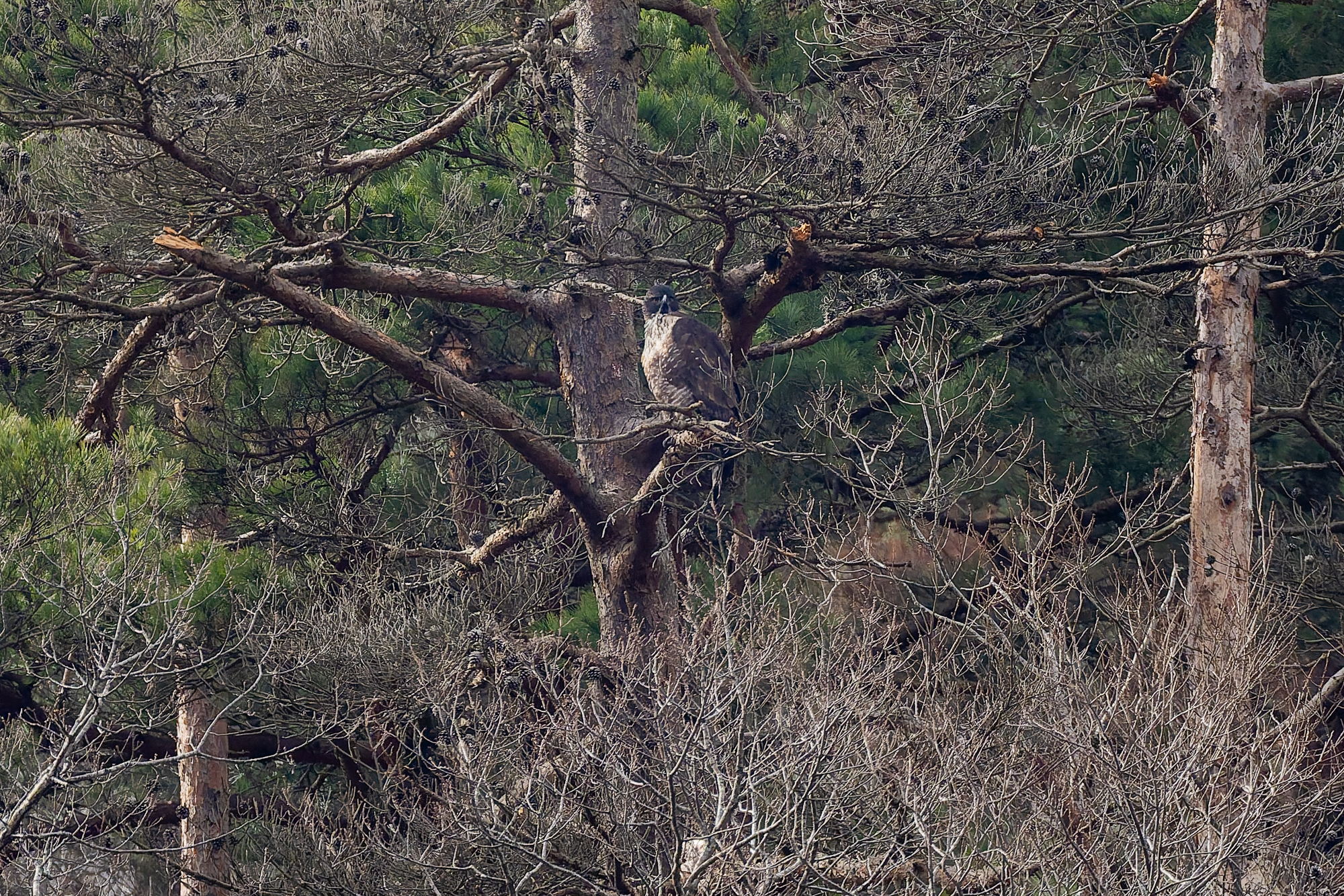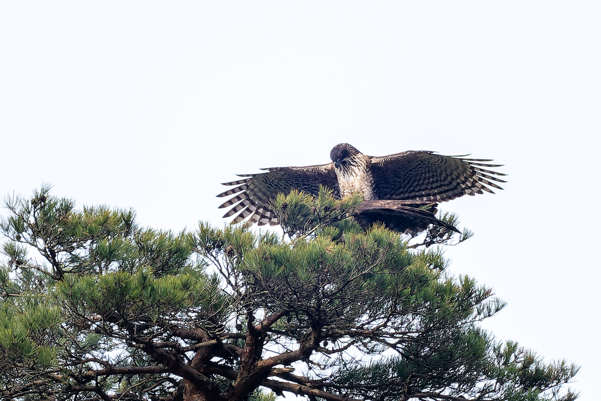 photocb 野鳥観察2026 2026年2月24日 2026年2月28日 クマタカ、オオタカ、トビ メスがオスに鳴いている クマタカはまだ繁殖行動が続いている。この時期が最も観察しやすい。 オスが来た クマタカの交尾 クマタカペア 先にオスが飛び出した オオタカが、 稜線の上を飛ぶ。飛び方は、滑翔と羽ばたき、大きさからハイタカかオオタカ。不鮮明だが、写真観察してオオタカかな? オオタカ オオタカ オオタカ メスが交尾の松から飛び出す しばらく交尾の松にとまっていが、飛び出し、山腹を飛んで稜線に消えた。 横縞のタカ斑が美しい 枯松にとまったオス 狩りから帰ってきたメス クマタカメス