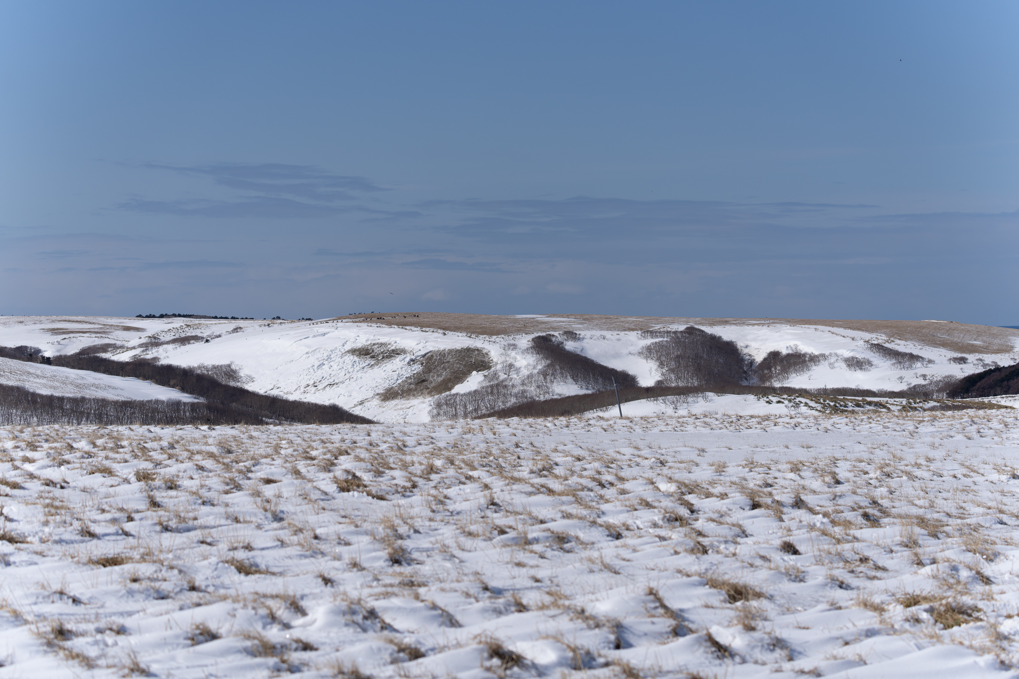 新日本海フェリーで舞鶴(3月8日)から小樽(3月9日)、深夜の移動で10日の朝に宗谷岬に入った。札幌周辺は吹雪で北海道の洗礼を受ける。路面凍結で移動に時間がかかったが、8時前には宗谷丘陵に立てた。天候は予報通り良好だった。風は東南東で微妙だが、オオワシにとって渡れない風ではない。早速、宗谷の丘にとまりオオワシを確認できた。さて観察開始だ。一羽で見かけると安心だ。