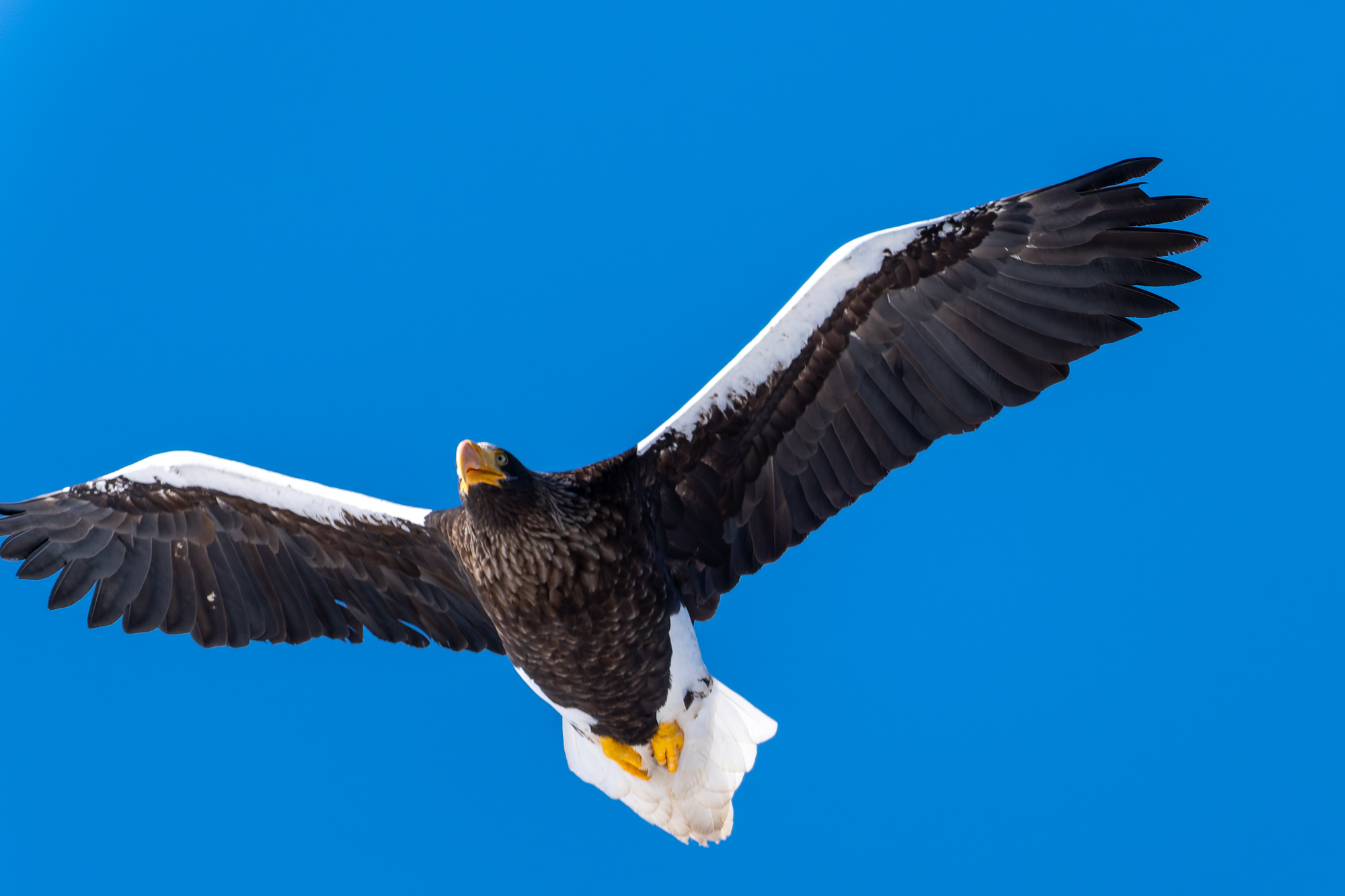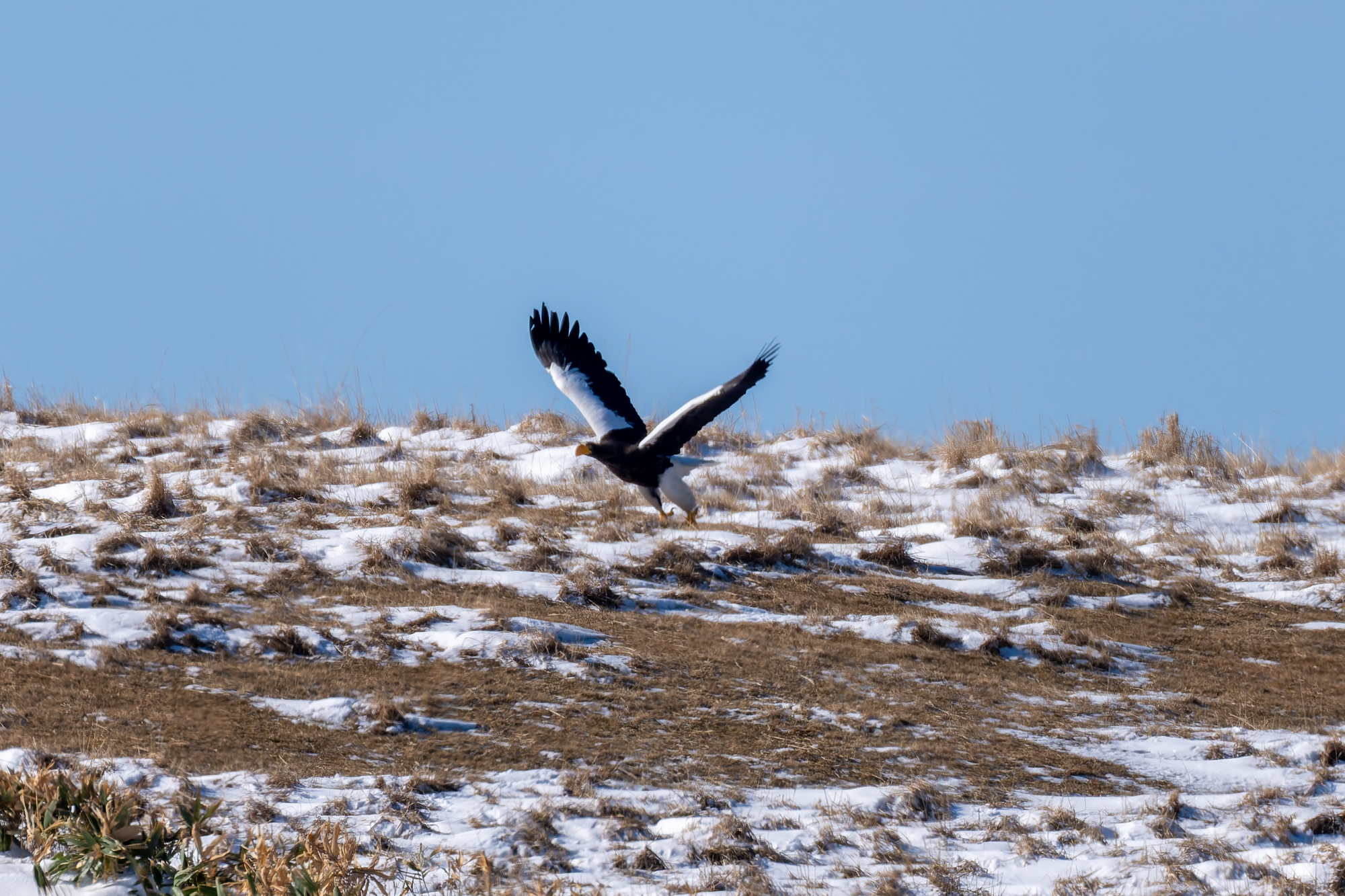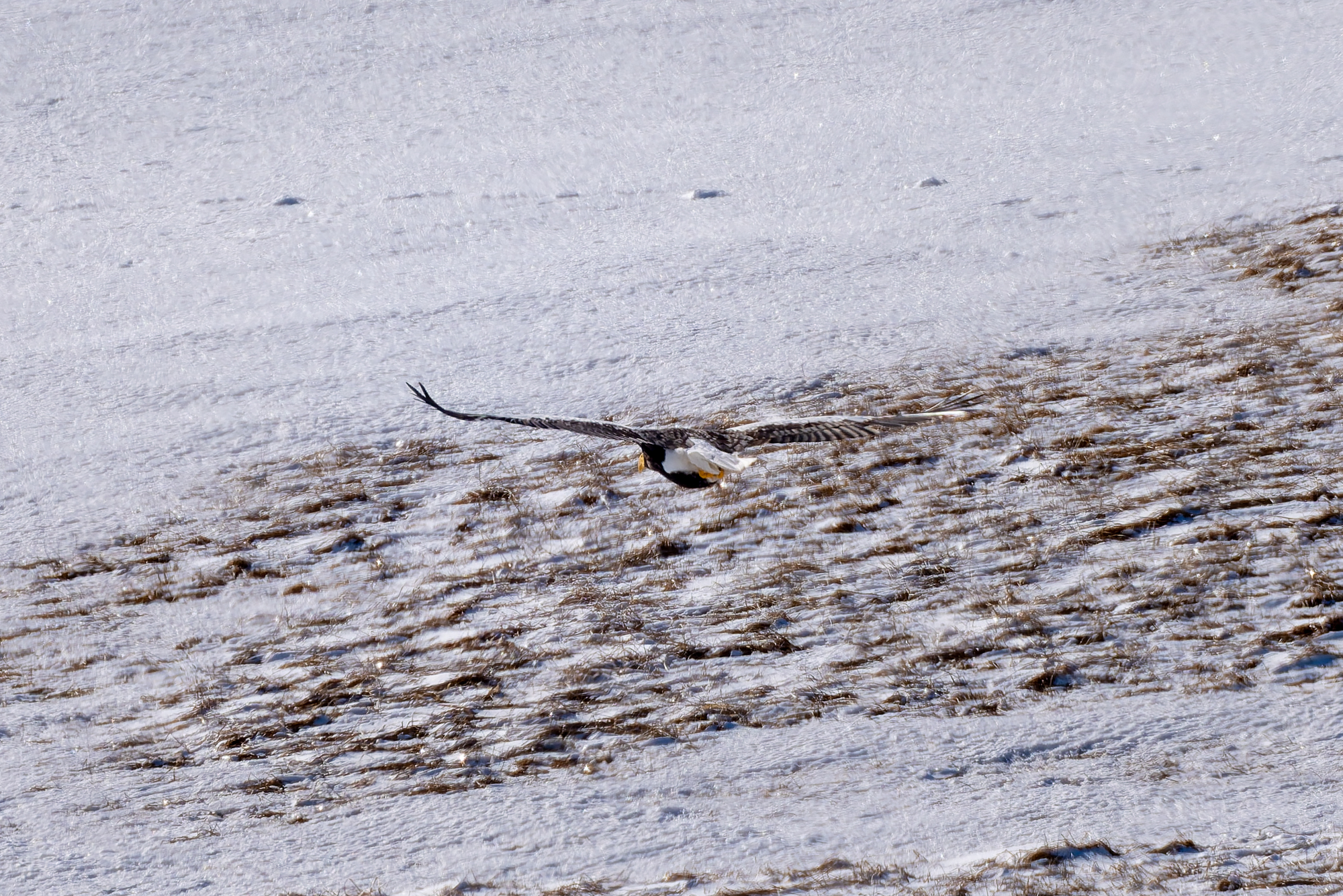 雪面に飛翔するオオワシの影