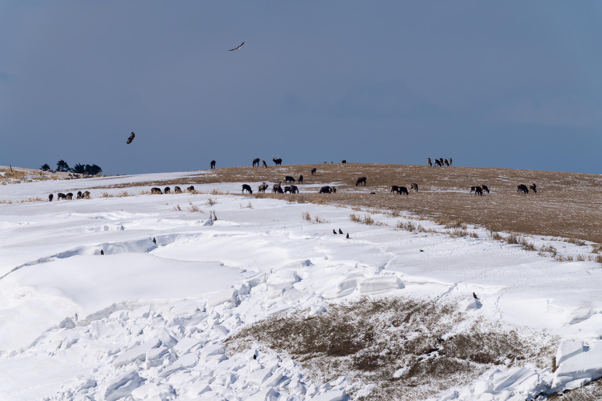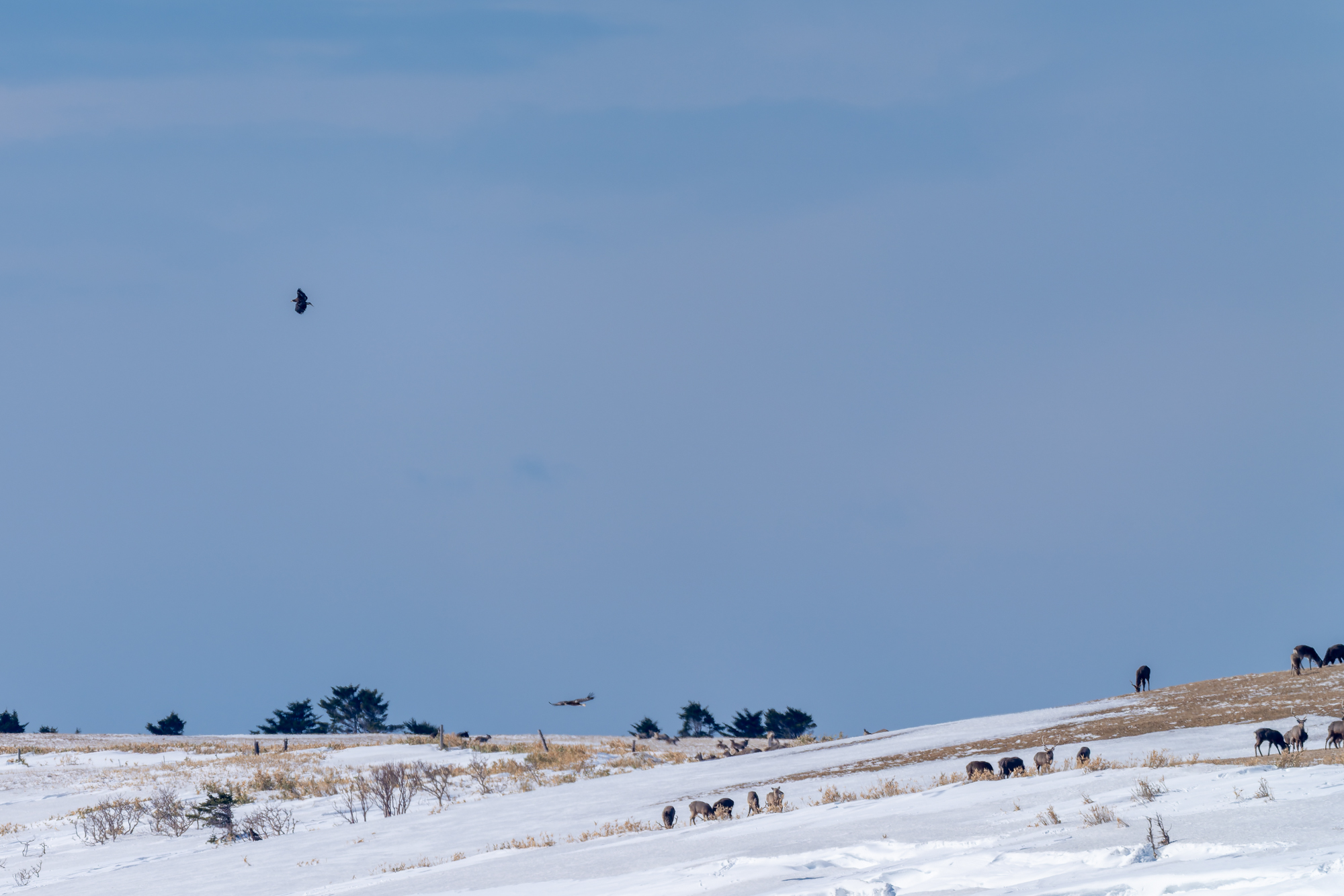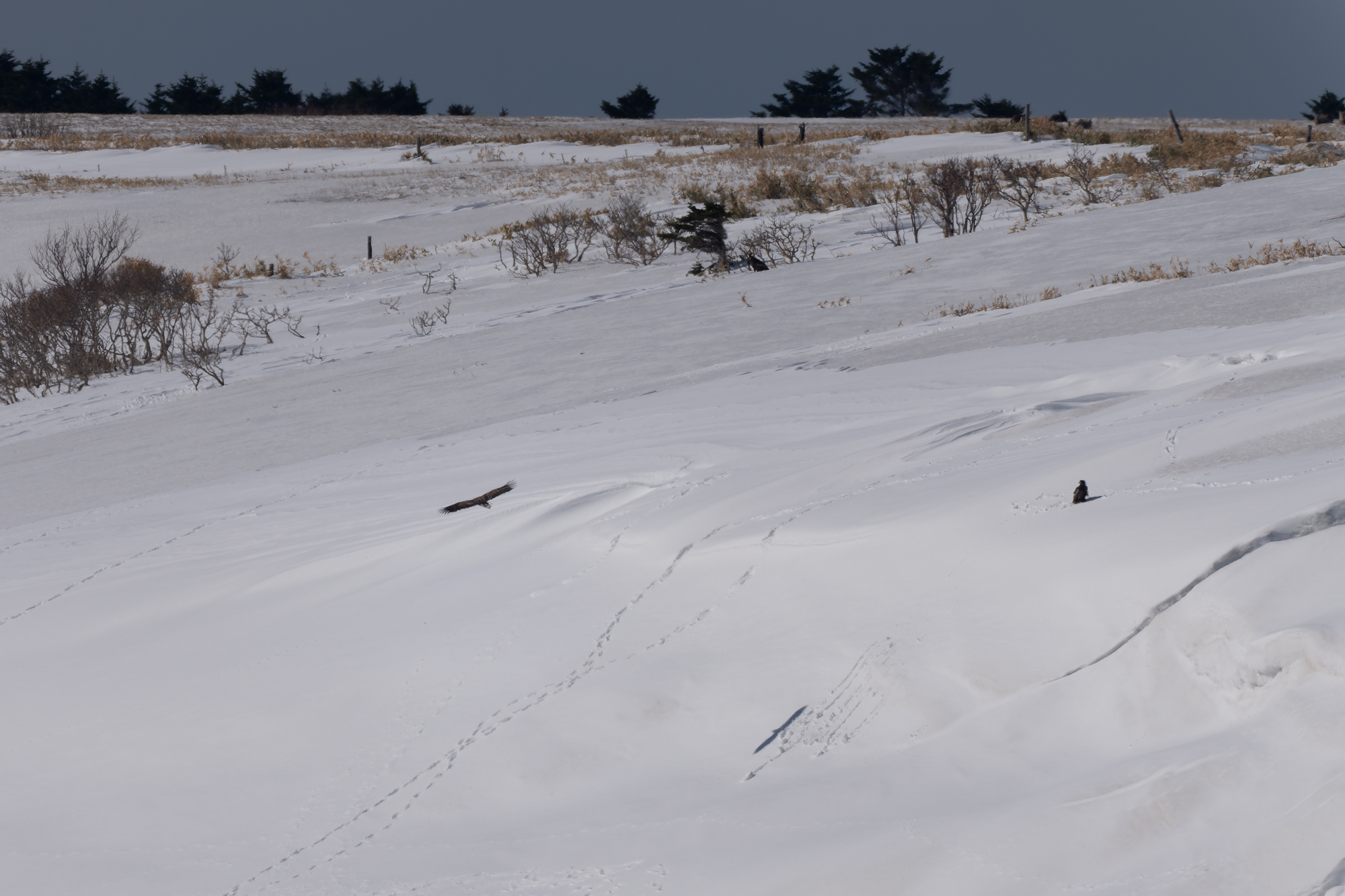 丘陵の積雪状況だが、昨年より雪は少なかった。まず、オオワシ二羽を確認出来た。飛び出し待ちだと思うが、昨年よりかなり少ない。昨年は天候が悪くオオワシが飛び出し待ちで滞留為ていたが今年は、天候が良いので順次飛びし出していると推測する。